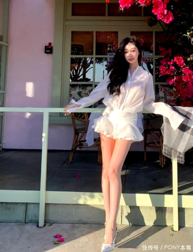 在穿搭上,尽显纯欲感!比如她选择了一款白色透视感衬衫外套,下半身搭配白色短裙,露出修长的美腿!无论是V领设计的衬衫和长度到大腿的短裙,比例超级优越!