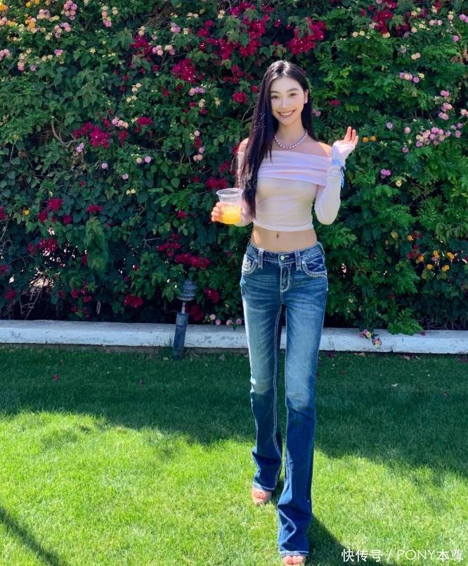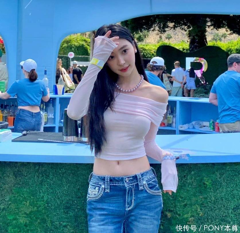 粉色一字肩长袖上衣,露出优越的一字肩,和腹肌,让人忍不住把视线集中到她的上半身!下半身的蓝色修身牛仔裤,脚踩高跟凉鞋,气质好到不得了!