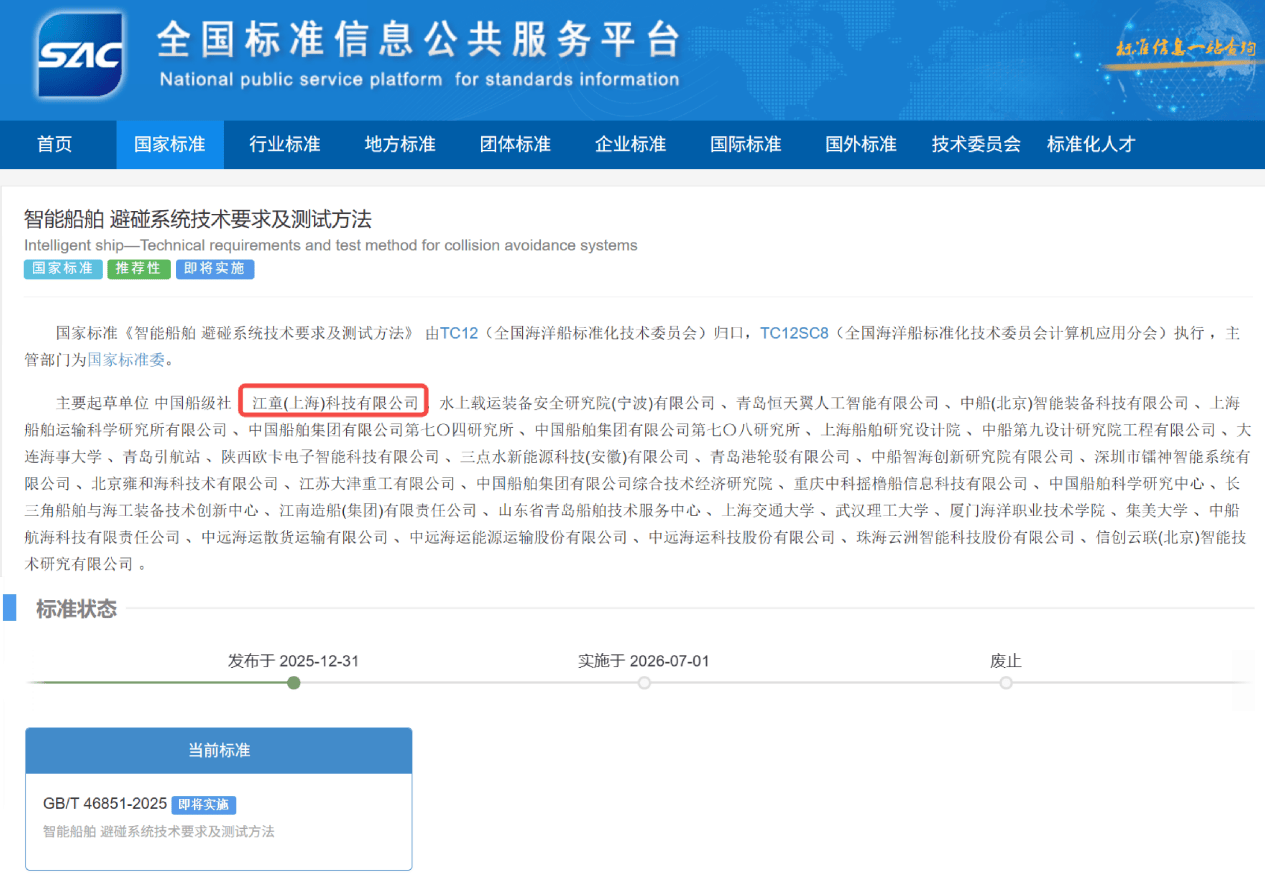 近期,由中国船级社牵头起草、波粒航海作为第二起草单位参与编制的《智能船舶 避碰系统技术要求及测试方法》国家标准(GB/T46851-2025)已通过国家市场监督管理总局(国家标准委)审批,并将于2026年7月1日正式实施,标准为智能船舶避碰系统的技术要求与实验方法提供了规范化指引。